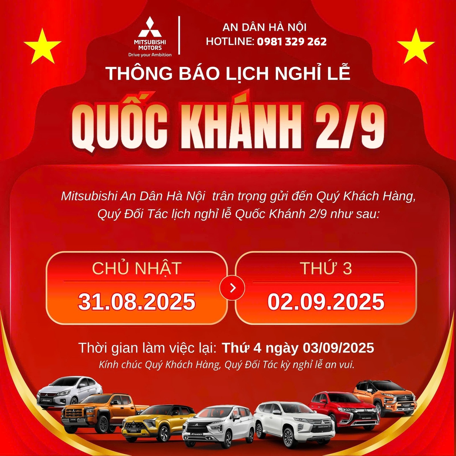 🎉 Mitsubishi Mitsubishi An Dân Hà Nội trân trọng thông báo đến Quý khách hàng, Quý đối tác thời gian nghỉ lễ Quốc Khánh 2/9 như sau: